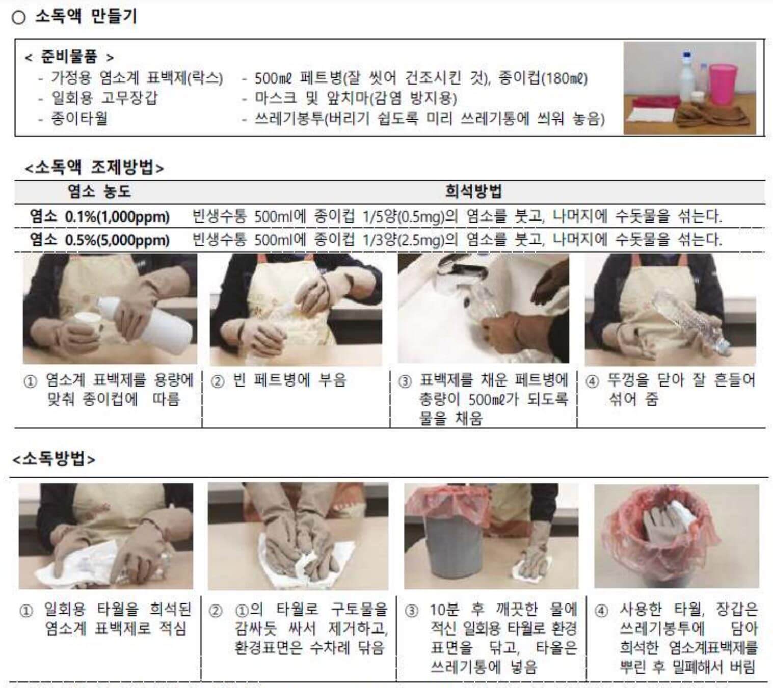 노로바이러스 소독을 위한 소독액은 시간이 지날수록 그 효과가 떨어지기 때문에, 소독 시마다 제조해서 사용하는 것이 좋다. 제일 먼저 가정에서 쓰는 염소계 표백제(일명 락스)를 500ml 빈 생수통에 종이컵 1/5~1/3 만큼을 채워준다. 그 이후에는 수돗물을 섞어 500ml를 맞춰준다음 잘 섞어 사용하면 된다.