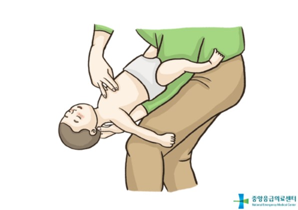 - 아이의 머리를 낮게 위치시키고 아이를 안은 팔은 허벅지에 고정시킨다.
