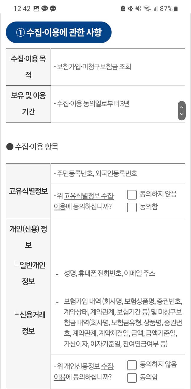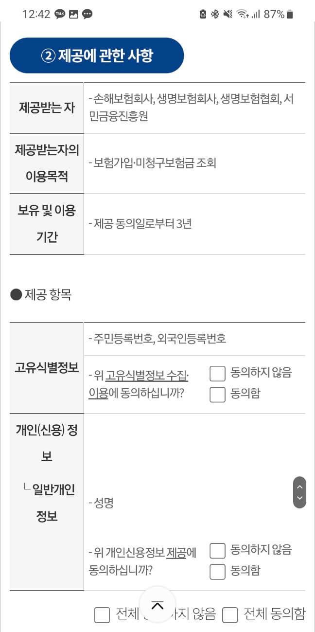본인인증을 진행하면 위와 같은 화면이 뜨게 되는데, 모든 항목에 동의함을 눌러준 다음에 조회를 시작한다.
