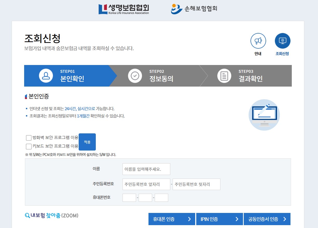 내가 어디 보험사에 보험을 가입했는지 기억이 나지 않고, 가입된 모든 보험을 확인하고 싶다면 손해보험협회 사이트에서 조회하는 것이 가능하다. 먼저 손해보험협회 사이트에 접속해준다, 이름과 주민등록번호, 휴대폰 번호를 입력한 다음 [휴대폰 인증], [아이핀인증], [공동인증서 인증] 세가지 중 한가지를 선택한 다음 본인 인증을 진행한다.
