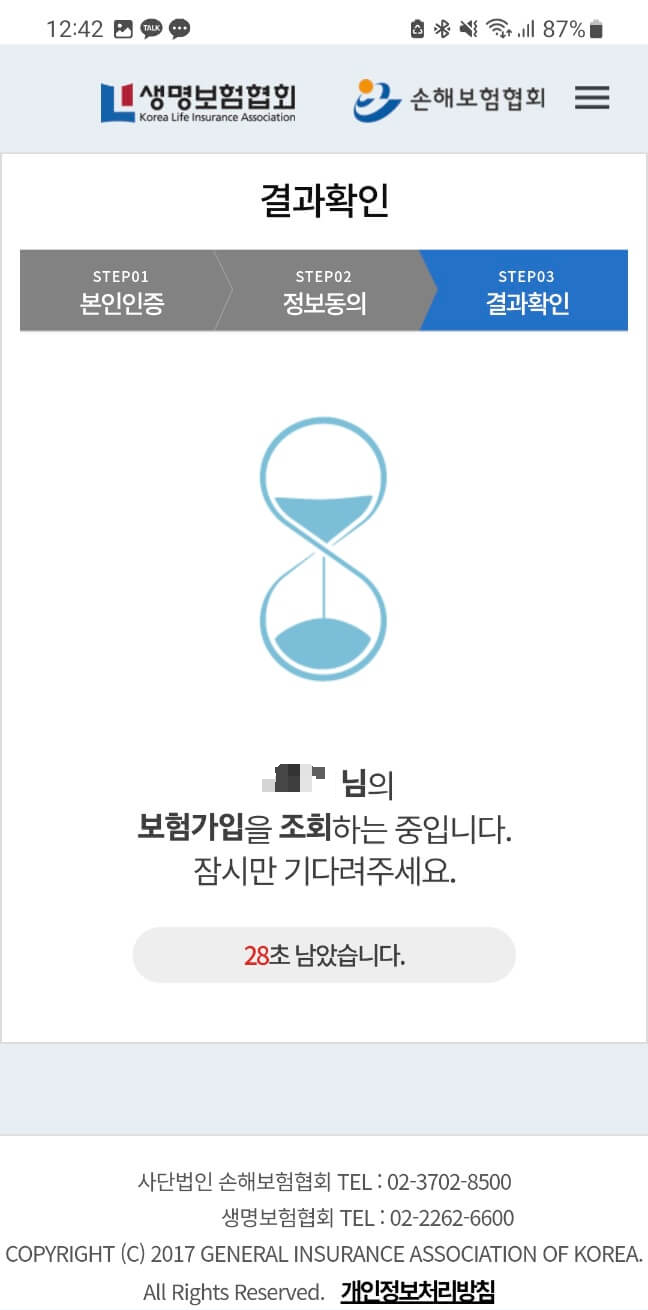 일정 시간동안 대기하면 내이름으로 가입되어 있는 보험들을 확인할 수 있다. 조회되는 보험을 살펴보고, 내 앞으로 되어 있는 실비 보험은 무엇인지, 어느 회사인지 알아보면 된다. 다만 우체국이나 농협 새마을 금고 보험은 조회되지 않는다.