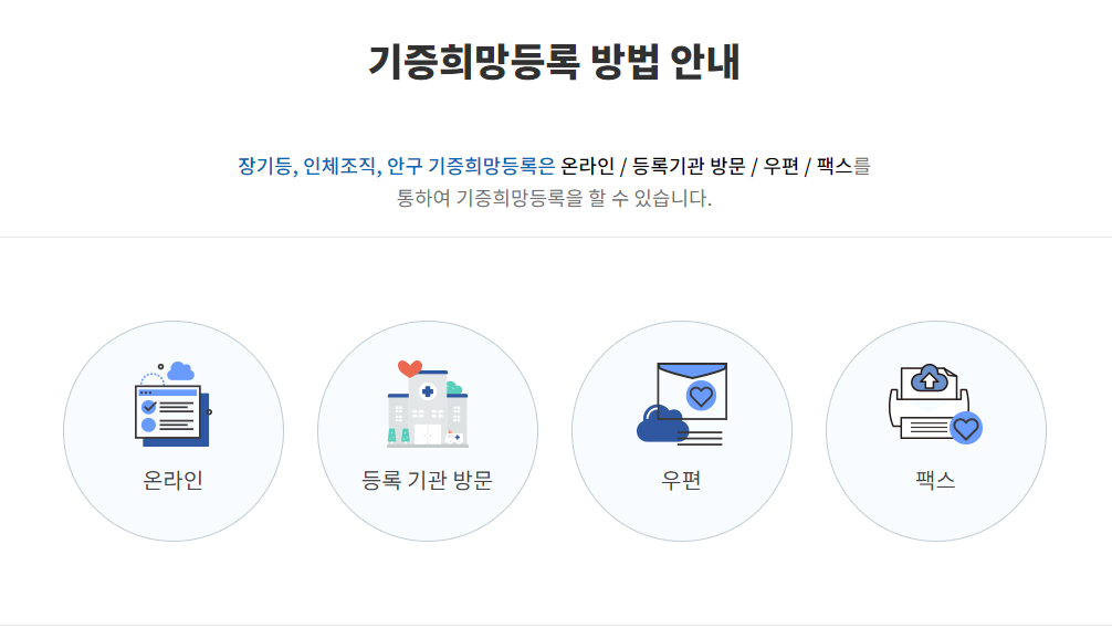 장기기증 신청 방법에는 온라인, 등록기관 방문, 우편, 팩스 등이 있다. 온라인이 제일 쉽고 편하며, 우편과 팩스의 경우 기관에 연락하면 우편을 통해 양식을 수령할 수 있다.