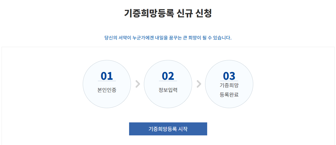 온라인의 경우 장기기증 신청 방법이 매우 쉬운데, [국립장기조직혈액원]-[기증희망등록]-[기증희망등록 신규신청]으로 이동한 이후 본인인증 및 개인의 정보를 입력 하면 끝이난다.
