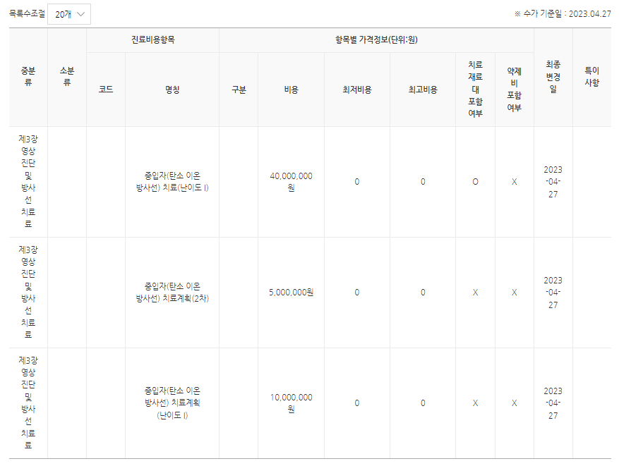 현재 세브란스 병원 비급여 진료비를 조회하면 중입자치료 비용이 조회가 가능하다. 가격을 보면 치료 난이도 별로 500만원에서 부터 5500만원까지 기재가 되어있으며 타 국가대비 매우 저렴한 가격임을 알 수 있다.