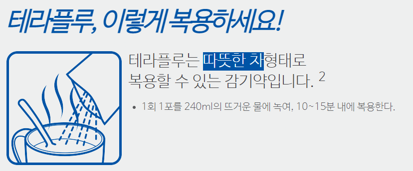 테라플루는 따뜻한 차로 복용 가능한 약품이다. 1회 1포를 뜨거운 물에 녹여서 마시면 되며, 10~15분 내에 복용해준다.